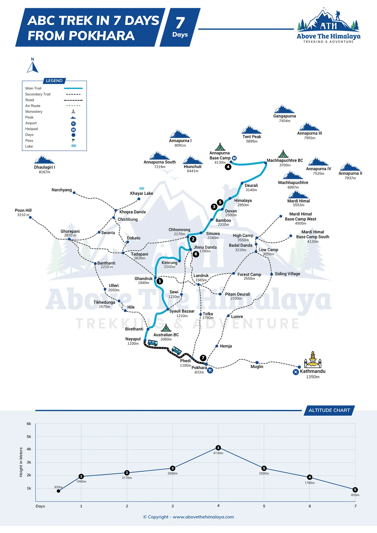 The ABC trek starts from Pokhara town at 822 m altitude and ends at Annapurna Base Camp at 4130 m. The round trip is approximately 74.2 km in Pokhara. An average of 15 km and 4 to 7 hours of walking is required daily. The total duration of the walk is seven days.