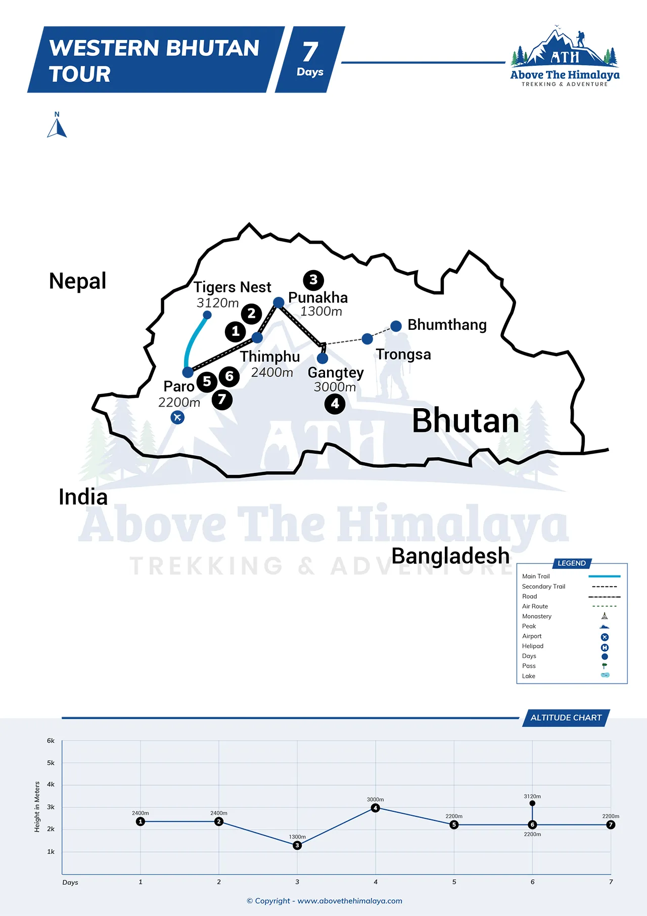Höhenprobleme sind bei einer Westbhutan-Tour minimal. Thimphu und Paro liegen auf 2,200–2,400 Metern, Punakha auf 1,200 Metern und Phobjikha auf knapp 3,000 Metern. Die Gipfel am Dochula-Pass und Tigernest erreichen eine Höhe von etwa 3,100 Metern. Die meisten Reisenden verspüren beim Bergaufsteigen lediglich Atemnot oder leichte, kurze Kopfschmerzen.