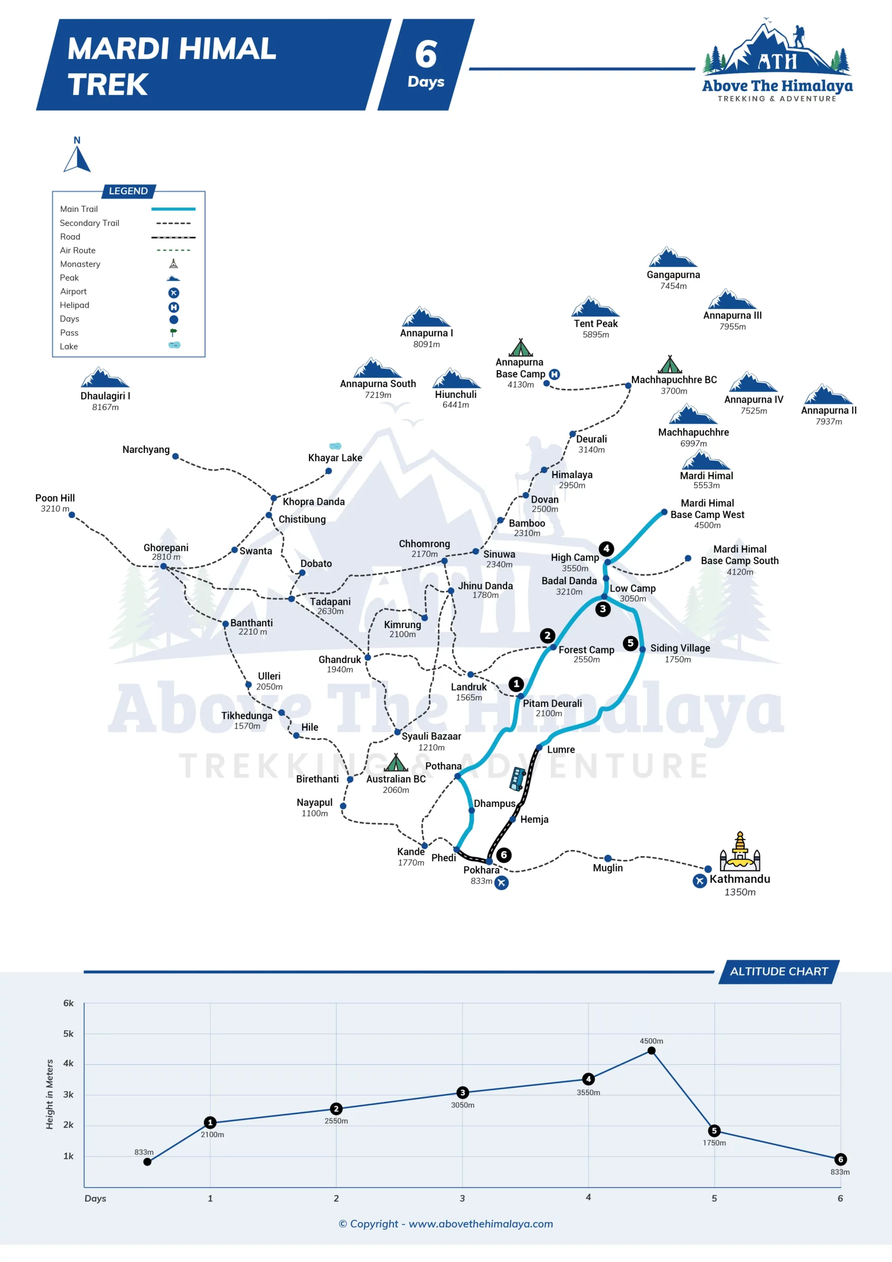 The Mardi Himal trek is the best way to explore the sparkling Himalayas. The Mardi Himal trek altitude is 4500m. The altitude of the Mardi Himal peak is 5587m.