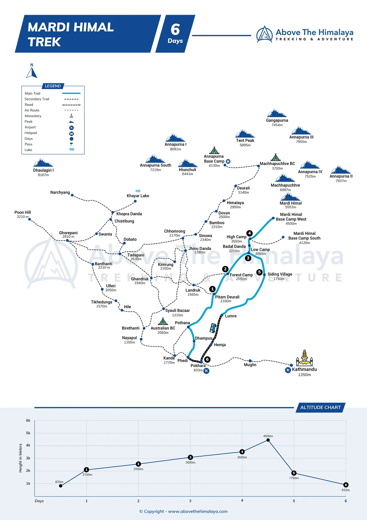 The maximum altitude of Mardi himal trek is 4500m and 14700 feet. The Mardi Himal trek is the best way to explore the sparkling Himalayas.