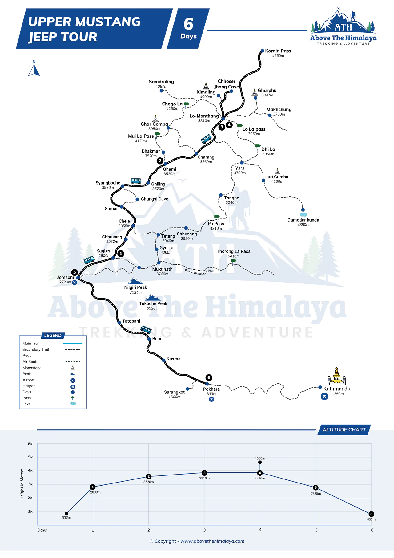 - Upper Mustang exploration for six days with a private guide and a 4WD vehicle